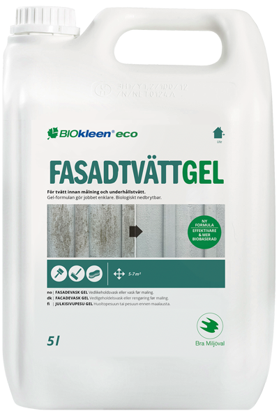 Vår fasadtvätt finns i två varianter. Fasadtvätt Eco som är märkt med Bra Miljöval. Samt Fasadtvätt TX som är mer koncentrerad och även förtjockad (tixotrop), vilket gör att den rengör ännu effektivare på djupet.