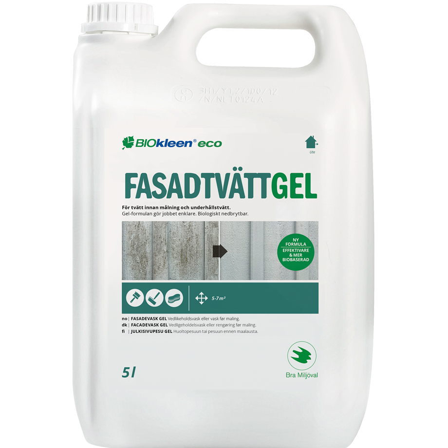 Med vår biologiskt nedbrytbara Fasadtvätt Gel Eco, kan du enkelt rengöra fasaden eller andra ytor utomhus. Exempelvis används Fasadtvätt Gel Eco före målning av din fasad eller för att tvätta och fräscha upp din husfasad vid underhållstvätt. Fasadtvätt kan även användas för rengöring av staket, träplank, utemöbler, lekstugan, gungställning, entrétrappor eller andra utomhusytor.